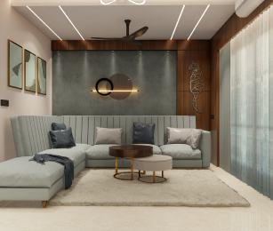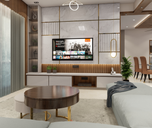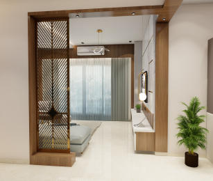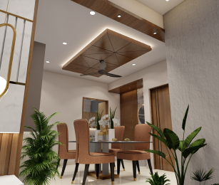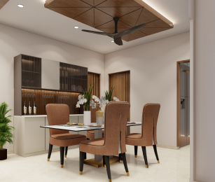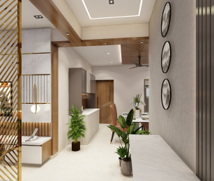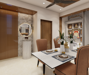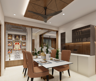 Embark on a journey into a space of serenity and sophistication, starting with the serene entry facade featuring a textured wall and intriguing partition detail. The dining area, adorned with a bar unit and traditional puja unit, harmoniously blends traditional elements with contemporary design. The textured paint on the hall's back wall adds depth, while the TV unit wall balances modern aesthetics with functionality.