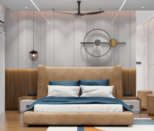 The Master bedroom captivates with a tranquil blue-grey color scheme and clean straight lines, achieving a perfect balance of comfort and visual appeal. The parents' bedroom exudes subtlety in a serene beige palette, echoing the theme of timeless elegance through straight lines.