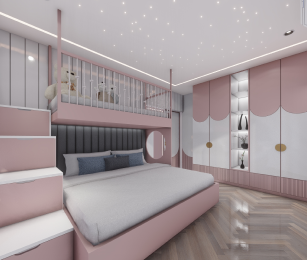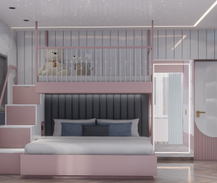 Step into the kids' bedroom, a vibrant and playful realm where blue reigns supreme. The walls boast panels adorned with simple and whimsical geometric patterns, infusing the space with a sense of energy and creativity. The blue color scheme is complemented by lighter tones, creating a lively yet balanced atmosphere.