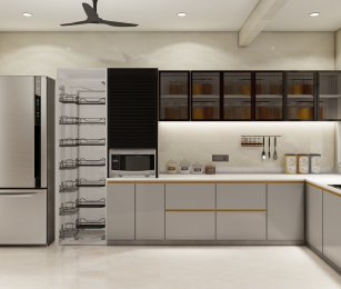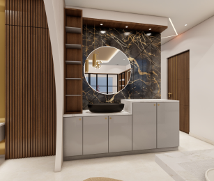 In the living room, the design ethos embraces simplicity and sophistication. Wall panels adorned with geometric patterns create an elegant focal point, adding depth to the space. Neutral hues such as whites, greys, and subtle beige tones dominate, casting a serene and timeless ambiance.