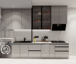 Guided by an eye-catching profile light detail, the residence unfolds seamlessly, revealing a kitchen that, despite its size, exudes simplicity and elegance. The chosen color scheme adds sophistication, and each element is curated for maximum functionality without sacrificing style.