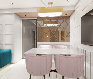 To enhance the sense of space, a strategically placed bevelled mirror wall next to the dining area creates an illusion of depth and openness. The living area extends to a small balcony, doubling as a charming bar unit for outdoor relaxation.