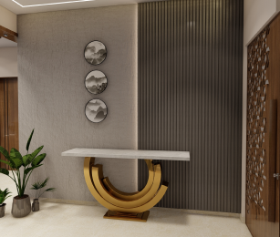 Embark on a journey into a space of serenity and sophistication, starting with the serene entry facade featuring a textured wall and intriguing partition detail. The dining area, adorned with a bar unit and traditional puja unit, harmoniously blends traditional elements with contemporary design. The textured paint on the hall's back wall adds depth, while the TV unit wall balances modern aesthetics with functionality.
