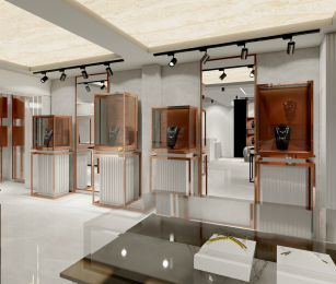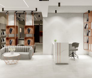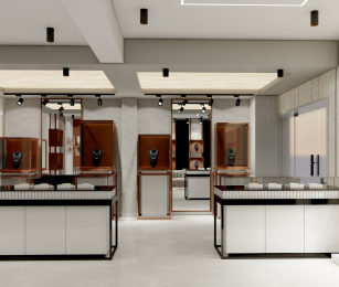 The interior design revolves around various shades of grey, providing a neutral canvas that allows the jewellery to stand out. Well-placed lighting, including recessed lights and pendant lights, adds a warm and luxurious ambiance to the space.