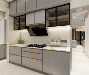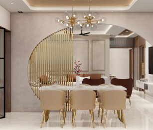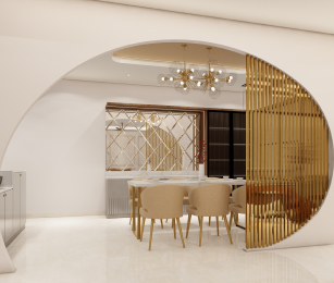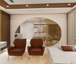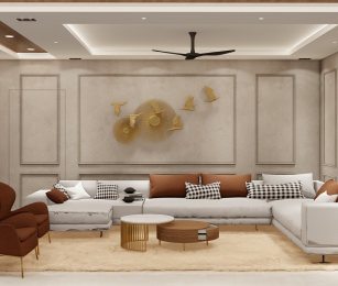 In the living room, the design ethos embraces simplicity and sophistication. Wall panels adorned with geometric patterns create an elegant focal point, adding depth to the space. Neutral hues such as whites, greys, and subtle beige tones dominate, casting a serene and timeless ambiance.