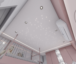 Step into the kids' bedroom, a vibrant and playful realm where blue reigns supreme. The walls boast panels adorned with simple and whimsical geometric patterns, infusing the space with a sense of energy and creativity. The blue color scheme is complemented by lighter tones, creating a lively yet balanced atmosphere.